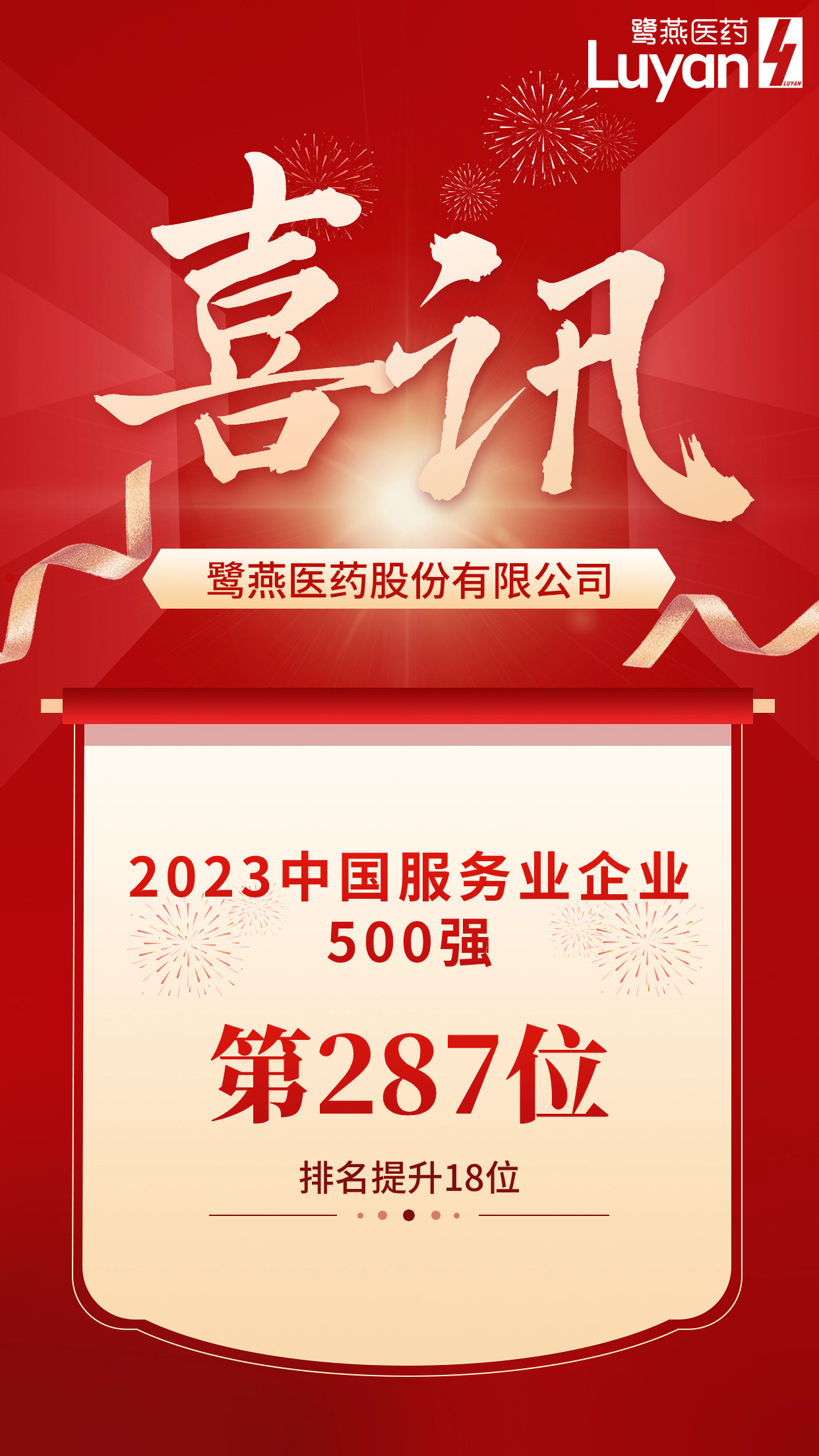 2023年9月20日,中國企業聯合會、中國企業家協會發布“2023中國服務業企業500強”等榜單,鷺燕醫藥股份有限公司位列第287位,比上年度排名提升了18位。